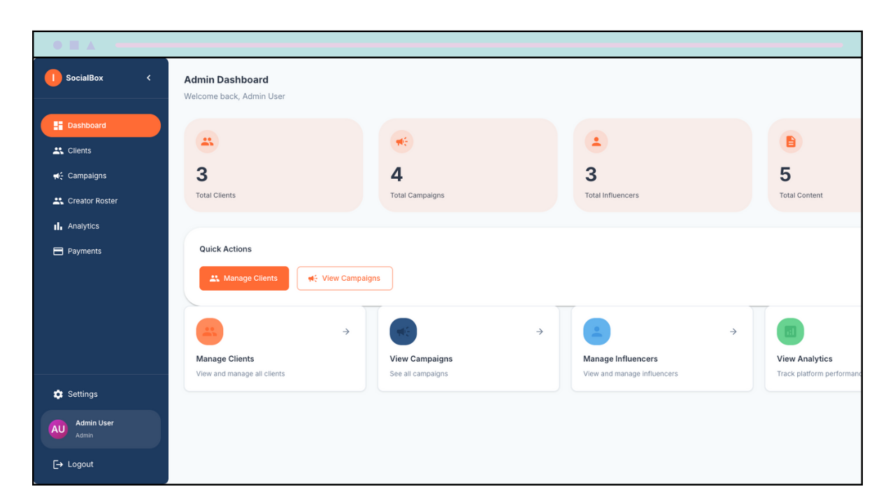 Clients have their own dashboard to review campaign progress, budgets, and content in real time. And you manage everything from an admin dashboard built to track multiple campaigns and every influencer in one clear, unified view.