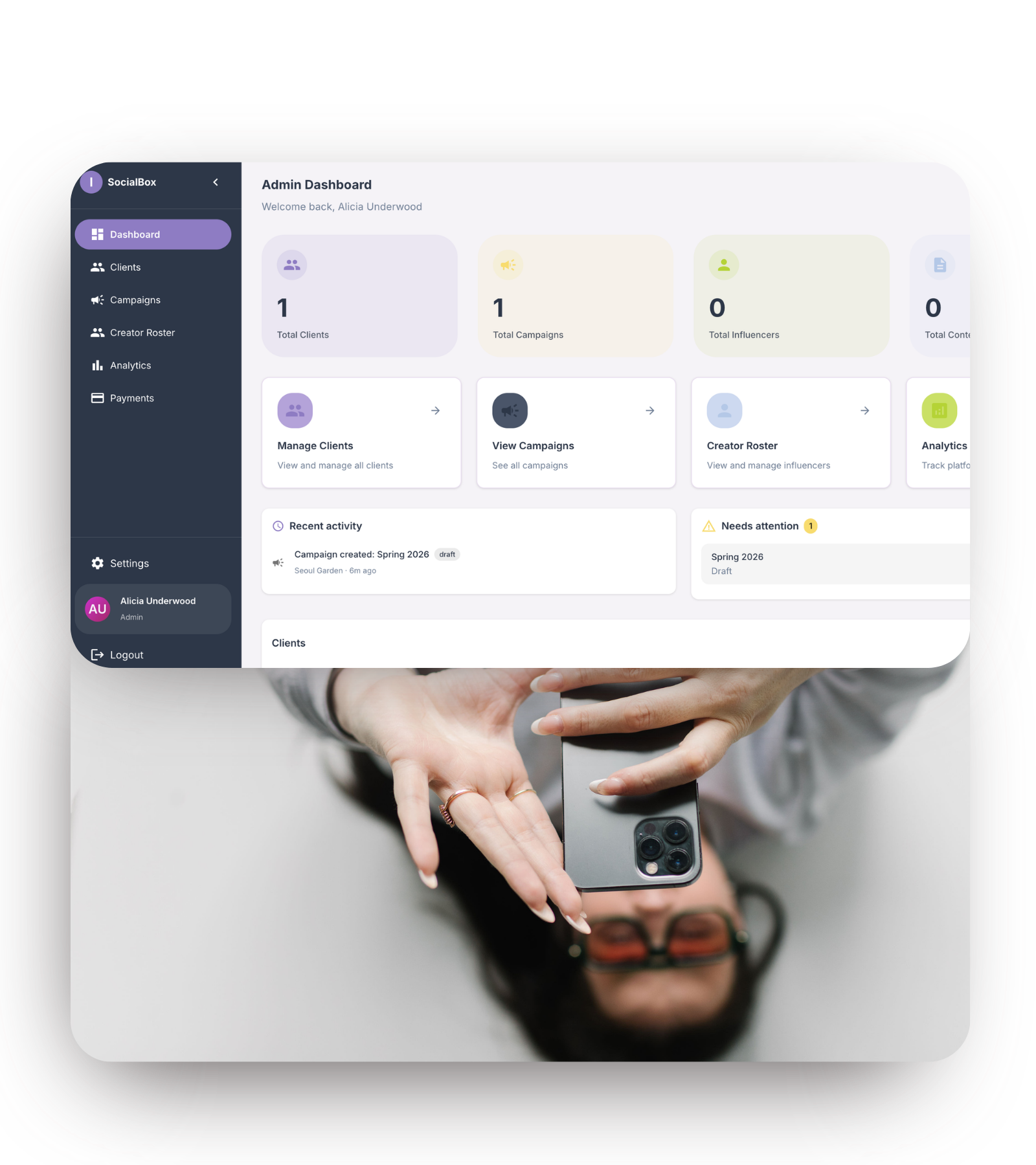 Your entire influencer operation in one place. Manage multiple campaigns and creators without the chaos. Give clients real-time visibility into their campaigns, budgets, and content. Let creators upload content directly and watch their earnings grow. From outreach to payment, everything is tracked and documented.
