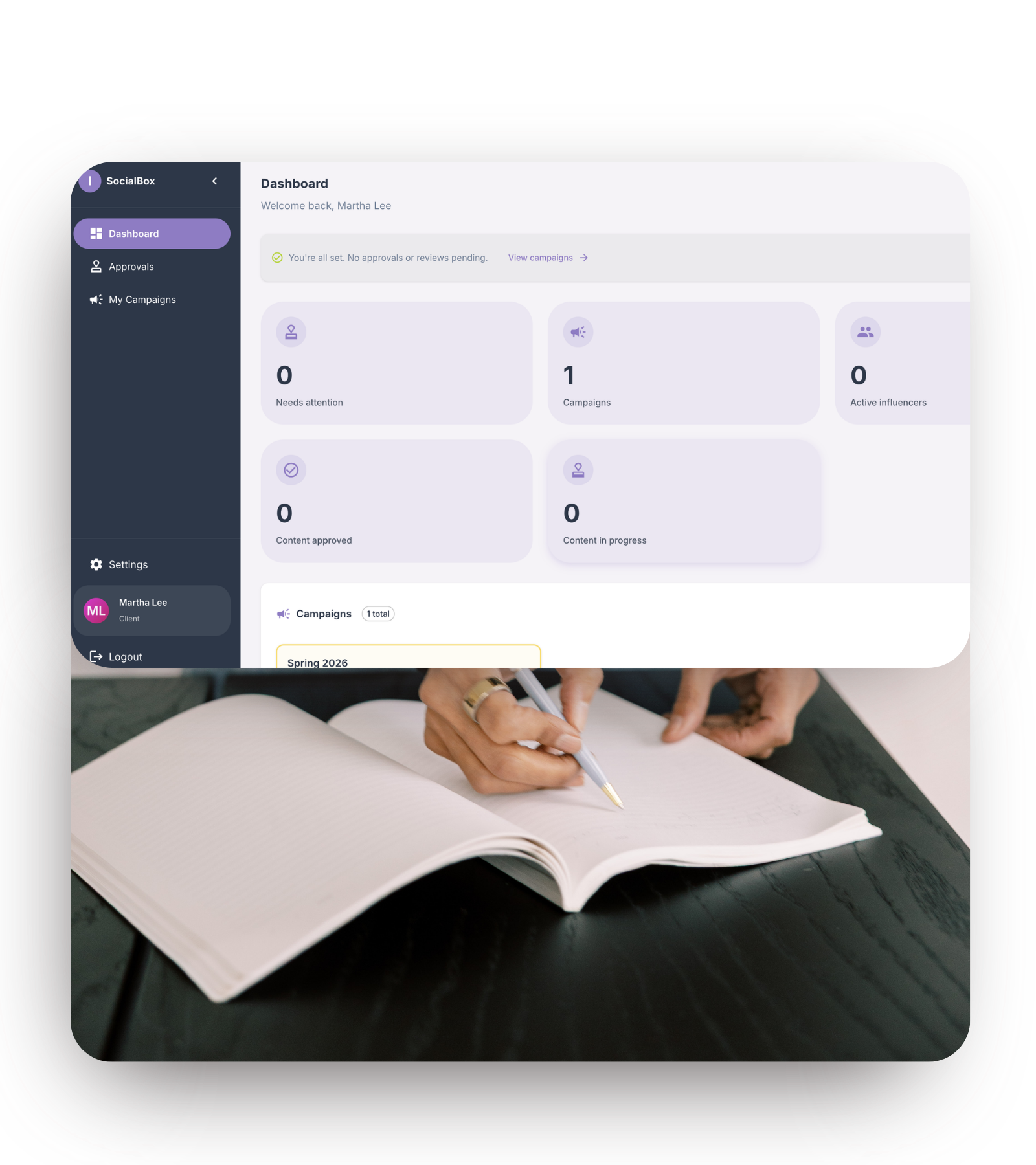 Your clients see exactly what matters to them: campaign progress, budget tracking, usage rights, and influencer content as it comes in. They have full visibility into their specific campaign without access to your other operations or confidential data. Real-time updates mean fewer status meetings and Slack/Teams messages, and faster approvals.